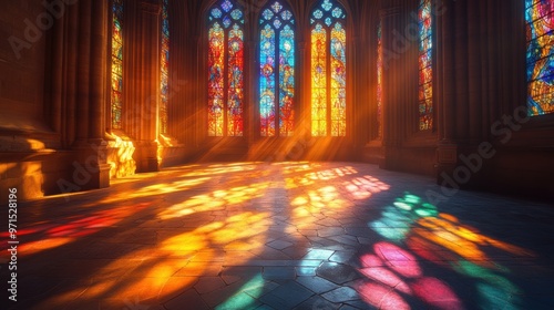 grand cathedral interior with light streaming through stained glass windows, colorful patterns on the stone floor, peaceful and reverent atmosphere