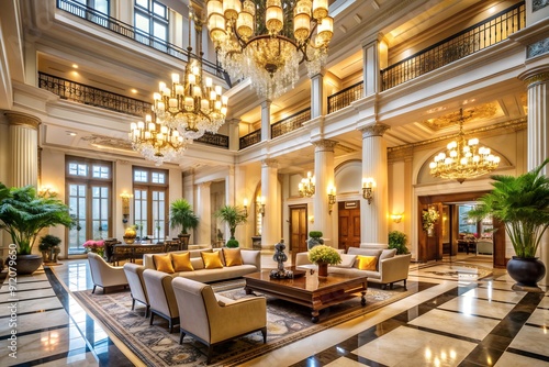 Grand Lobby Opulence: Ornate Chandeliers Illuminate a Palatial Interior