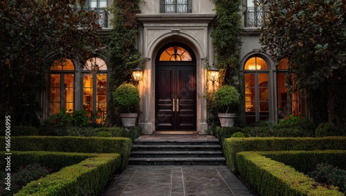 Grand mansion entrance at twilight