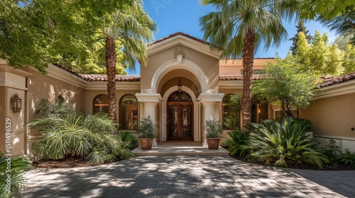Grand mansion entrance with ornate doorway, framed by lush greenery; timeless elegance of luxury estate architecture.