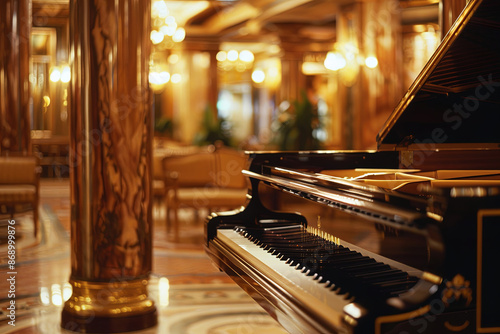 Grand piano amid room columns, elegant musical setting