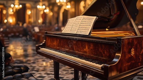 Grand piano, sheet music, church, dimly lit.
