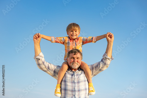 Grandfather and boy having fun outdoor