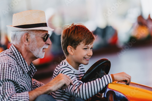 Grandfather and grandson having fun and spending good quality time together in amusement park. They enjoying and smiling while driving bumper car together.