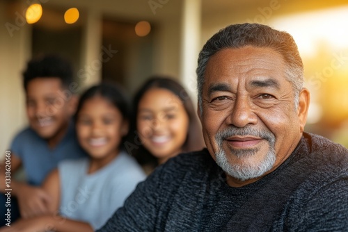 Grandfather enjoys quality time with grandchildren in warm evening light at home