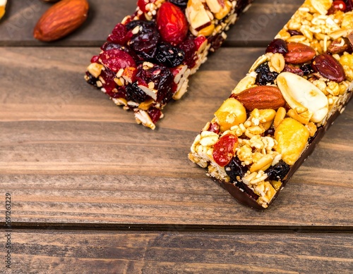 Granola bars on a wooden surface