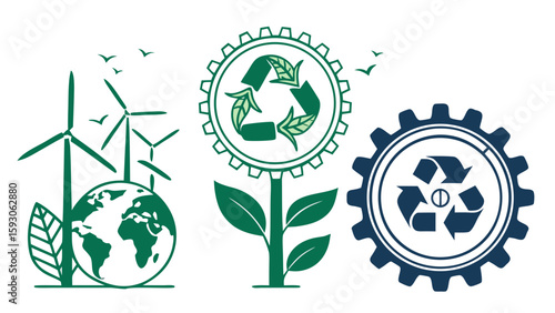 Graphic depicting wind turbines earth and recycle symbols in green and blue tones on white background