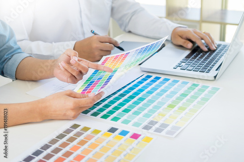 Graphic design partners working together renovation and technology concept - on a desktop computer and selection using some color swatches.
