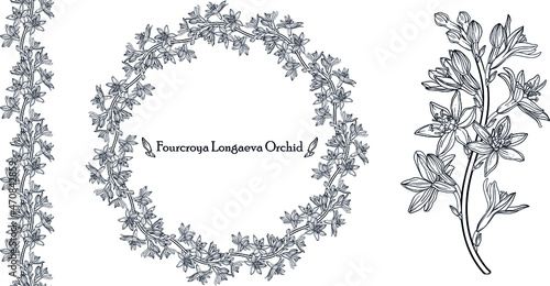 Graphic vector floral wreath with archidia flowers. Black and white drawing