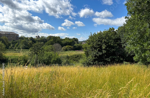 Grasses sway like lullabies, clouds wander soft and slow— a gentle field unfolds, with Victorian rooftops on show in Shipley, Bradford, UK.