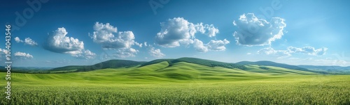 Grassy field with hills and clouds in the distance