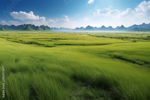 grassy field with mountains in the distance and a blue sky