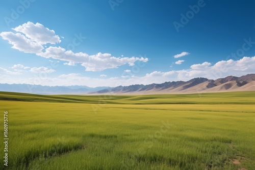 grassy field with mountains in the distance and a blue sky