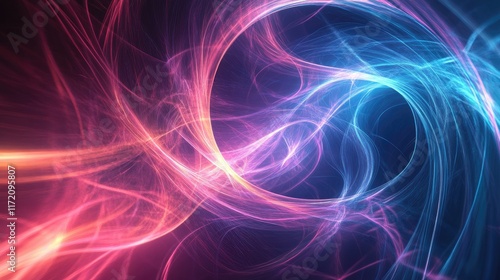 Gravity fields visualized as swirling, radiant waves with a neon color palette and soft glowing effects in a futuristic setting.