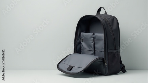 Gray backpack with an open front pocket displayed on a plain surface, highlighting its spacious compartments and minimalist design