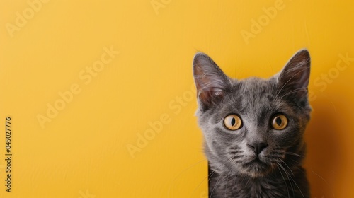Gray cat peeking on yellow background with copy space