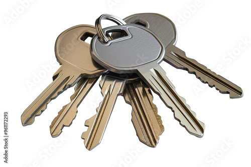 Gray House Keys with Keychain, Detailed View. Closeup keychains with alpha channel. Transparent. Cut-Out.