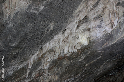 Gray karst cave. Rock formations in the cave, stalactites and stalagmites. Abstract gray grunge background. Stone texture background. Spotted abstract stone. Russia, Bashkortostan, a fairy cave