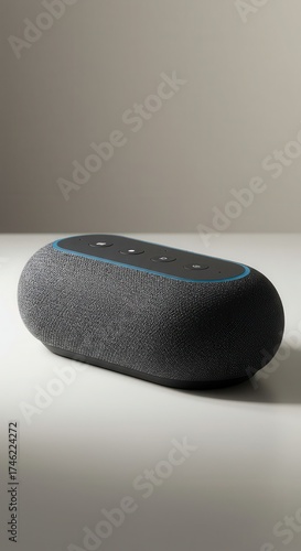 Gray oval electronic speaker with blue accents sits on a white surface.