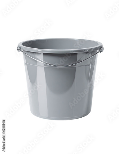Gray plastic bucket with metal handles. A simple, round, light gray plastic bucket. It has a slightly tapered shape. The metal handles are visible. Studio shot, isolated