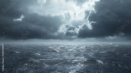 Gray sky with stormy black clouds and bright lightning bolts on the horizon 3d illustration