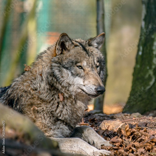 Gray wolf chill and hides in the green leaves forest