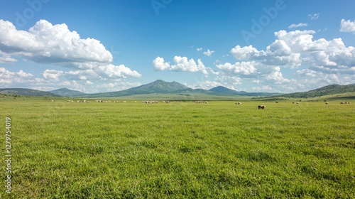 Grazing animals on green plains under blue sky, mountains background, nature landscape for travel brochure