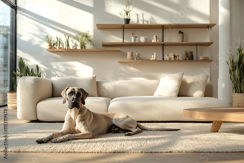 Great Dane Relaxing in Modern Sunlit Living Room with Minimalist Decor