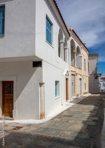 Greece. Andros island Chora town Cyclades. Cobblestone alley old houses sun blue sky. Vertical