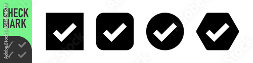 Green and black check mark icon set : Set of many green check mark icons in various shapes: square, rounded, circle, and outlined rounded square. perfect for UI, tasks, and confirmations