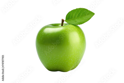 Green Apple With Leaf. A green apple with a leaf attached to its stem is depicted in this close up shot. The apple appears fresh and ripe, with the leaf adding a touch of nature to the composition.