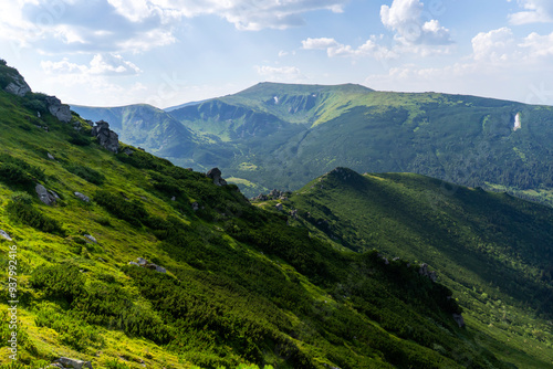 Green beautiful mountains in the sunny day.