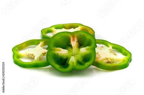 Green bell pepper slices isolated on white background.