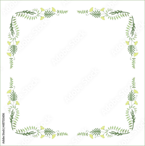 Green botanical frame with tropical leaves in jungles decorative corners for greeting cards, banners, business cards, invitations, menus. Isolated vector illustration.