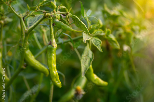 Green chili peppers growing on tree in the garden