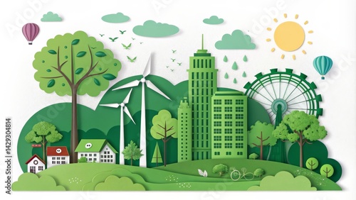 Green Cityscape Paper Art, Eco-Friendly Urban Design, Wind Turbines, Ferris Wheel, Papercut Illustration Eco-Friendly City, Sustainable Design