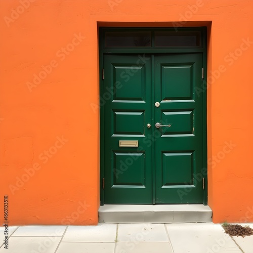 Green door set in an orange wall, creating a vibrant architectural contrast.