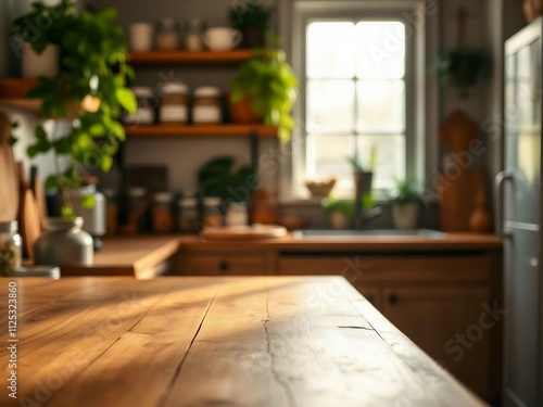 Green Empty wooden table with the bright white interior of the kitchen as a blurred background behind the bokeh golden Sunshine.