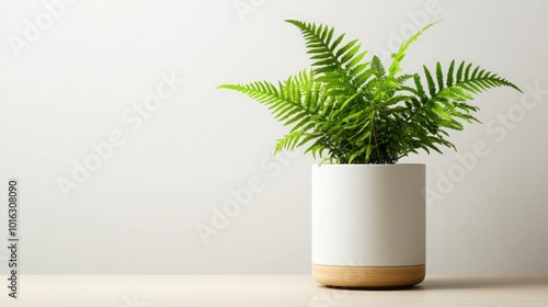Green Fern Plant in White Pot on Wooden Table with White Wall Background