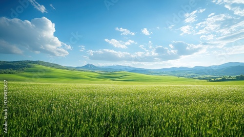 Green field landscape. Sunny day. Blue sky. White clouds. Mountains in background. Peaceful meadow. Nature scene.
