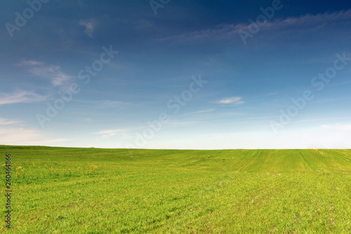 green field of grass and blue sky with clouds