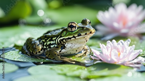 Green Frog Amongst Lily Pads and Water Lilies