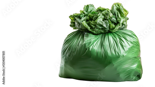 Green garbage bag overflowing with waste isolated on a black background, stark visual of excess