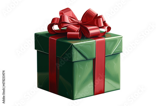 Green gift box with red ribbon on transparent background, a Christmas symbol