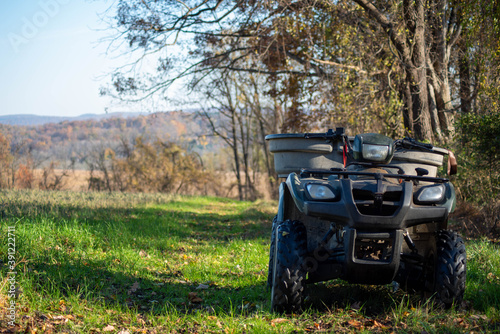 Green grass and rural landscape background with atv stopped on the trail off center in foreground. Natural light with copy space.
