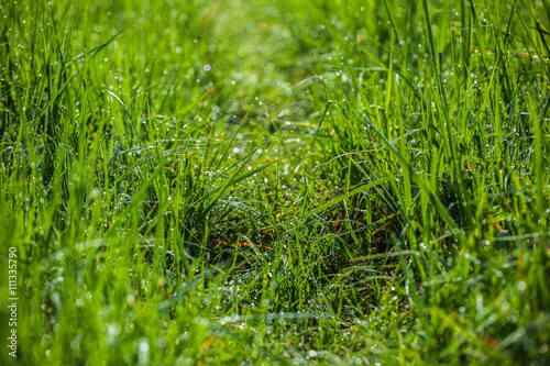 Green grass. Dew drops close-up on fresh green spring grass. The