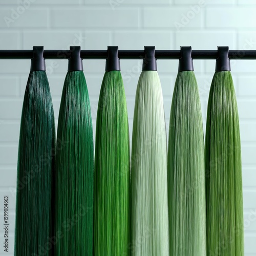 Green hair extensions showing variety of shades hanging against white brick wall backdrop