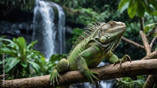 Green iguana on branch, scenic jungle waterfall