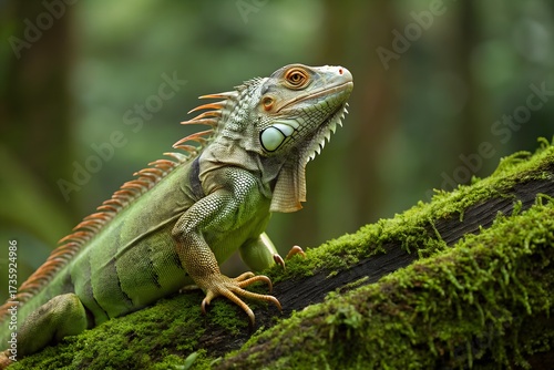 Green Iguana Resting on a Mossy Tree Branch in the Lush Rainforest A Wildlife Close-Up
