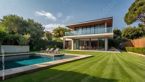 Green lawn with a garden including swimming pool in a modern house and blue sky